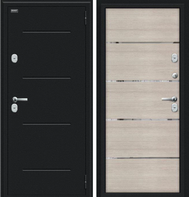 Надежная входная Дверь Браво Thermo Лайн Букле черное/Cappuccino Veralinga премиум класса по цене 48 650 руб. Большая толщина стали защитит от проникновения в ваш дом, квартиру или коттедж. Используется очень качественная фурнитура: замки, цилиндры, ручки, защелки. Покрытие и отделка двери изготовлено под внимательным контролем производителя. Дверь имеет долгий срок службы и гарантию.